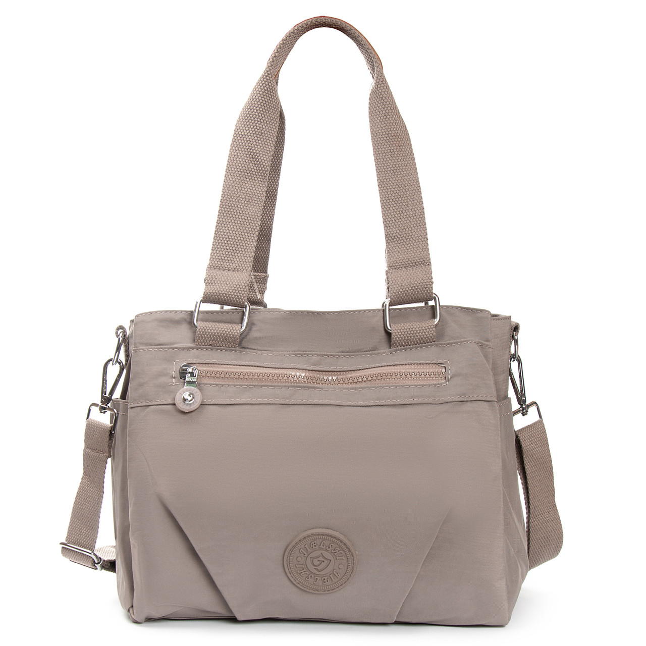 Жіноча сумка Jielshi. Виготовлена з водовідштовхувального текстилю. Три відділення: центральне закривається на блискавку. а бічні на магнітні кнопки. Усередині центрального відділення є велика бічна кишеня на блискавці та відкрита подвійна кишеня. На фасаді розміщена одна містка кишеня на блискавці. А на торцях сумки розташовані відкриті кишені.